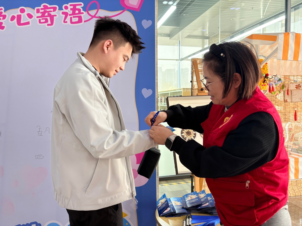 3月28日,淄博市图书馆内暖意融融,一幅幅色彩斑斓的作品整齐陈列,有曼陀罗彩绘、五谷粮画、编织、非遗面塑、毛毡画、琉璃簪花、丙烯画、24节气系列绘画作品等。每一幅作品,都是孤独症孩子从封闭走向表达、从无序走向圆满的见证,诉说着他们与这个世界独特的对话方式。他们将刻板转化为专注,用作品完成无声的自我表达。在阅览室,尚老师用通俗易懂的语言,向现场的家长和小朋友们介绍与孤独症孩子相处的三个魔法,普及孤独症相关知识,呼吁更多人学会理解与包容。宣讲结束后,老师们手持宣传单页,主动向观展者发放,细致解答大家的疑问,用专业与耐心,为孤独症群体争取更多的理解与支持。展厅一角的留言板前,有不少观展者写下了自己的祝福。每一句真诚的话语,都承载着一份善意。老师们为留下祝福的爱心人士系上丝带,让这份温暖与善意有了具象的表达,也让融合的种子在每一个人的心中生根发芽。